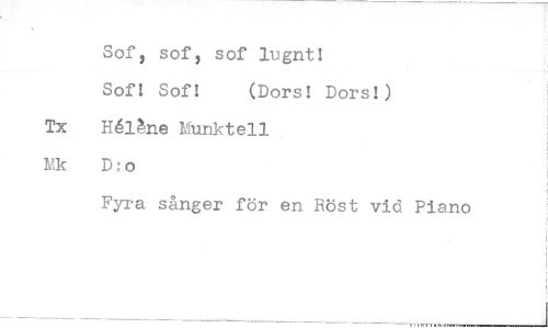 //// Sof, sof, sof lugnt! //// Sof! Sof! (Dors! Dors!) //// Tx Hél^ne Munktell Mk D:o //// Fyra sånger för en Röst vid Piano