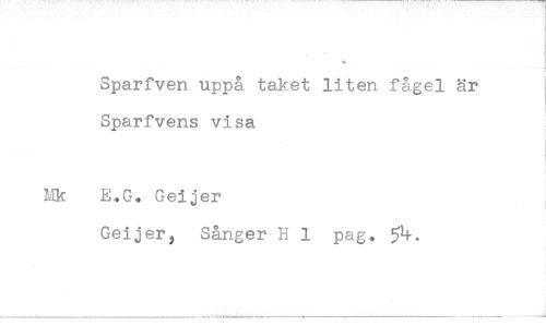 //// Sparfven uppå taket liten fågel är Sparfvens visa //// E,G. Geijer //// Geijer, Sånger H 1 pag, 54.