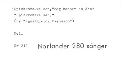 //// "Spiskroks-valsen,"säg känner du den? "Spiskroksvalsen." //// (Ur "Konstgjorda Svensson") //// Mel. //// Nr 212 Nortander 280 sånger