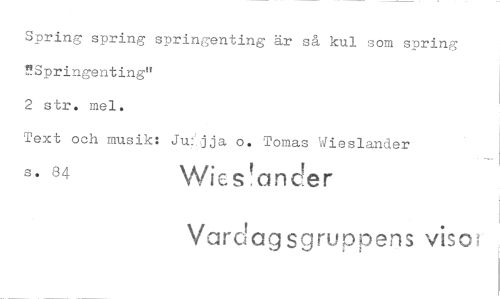 //// Spring spring springenting är så kul som spring "Springenting" //// 2 str. mel. //// Text och musik: Ju:'jja o. Tomas Wieslander //// s- 84 Wieslander Vardag sgruppens viso