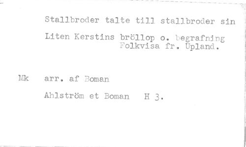 //// Stallbroder talte till stallbroder sin //// Liten Kerstins bröllop o. begrafning Folkvisa fr, Upland. //// arr. af Boman Ahlström et Boman H 3*