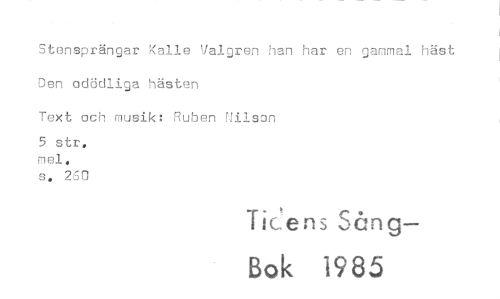 //// Stensprängar Kalle Valgren han har en gammal häst Den odödliga hästen //// Text och musik: Ruben Nilson //// 5 str. nel, //// s. 260 //// Ticens Sång—