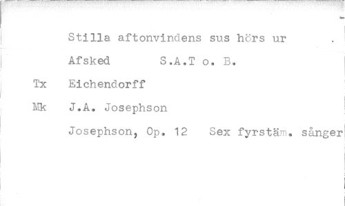 //// Stilla aftonvindens sus hörs ur Afsked S.A.T o. B. //// Tx Eichendorff //// Mk J.A. Josephson ' //// Josephson, Op. 12 Sex fyrstäm. sånger]