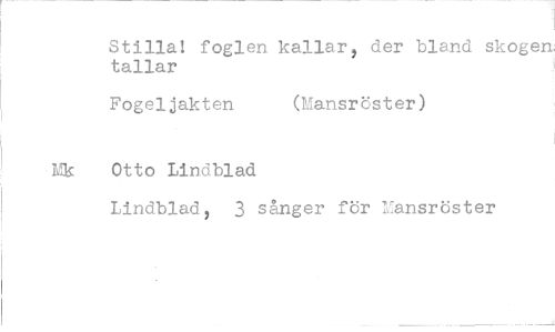 //// Stilla! foglen. kallar, der bland skogen; tallar //// Fogeljakten (Mansröster) //// Otto Lindblad //// Lindblad, 3 sånger för Mansröster