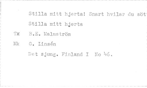 //// Stilla mitt hjerta! Snart hvilar du söt Stilla mitt hjerta Tx B.E, Malmström Nk G, Linsen //// Det sjung, Finland I No 46.