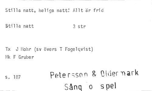 //// Stilla natt, heliga natt! Allt är frid //// Stilla natt 3 str //// Tx J Mohr (sv övers T Fogelqvist) Mk F Gruber //// s. 187 Pete r^son & Såna o //// Ci-ier i^ark spe)