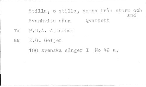 //// Stilla, o stilla, somna fran storm och //// snö //// Svanhvits sång Qvartett //// Tx P.D.A. Atterbom Mk E,G, Geijer //// 100 svenska sånger I No 42 a.