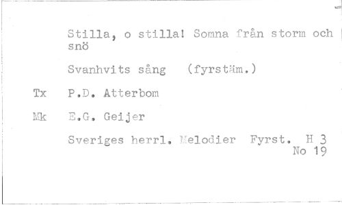 //// Stilla, o stilla! Somna från storm och //// snö //// Svanhvits sång (fyrstäm.) //// Tx P.D. Atterbom //// Mk E.G, Geijer //// Sveriges herrl. Melodier Fyrst. H3 //// No 19