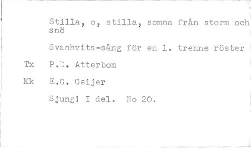 //// Stilla, o, stilla, somna från storm och //// snö //// Svanhvits-sång för en 1, trenne röster Tx P.D, Atterbom Mit E^G, Geijer //// Sjung! I del. No 20. I