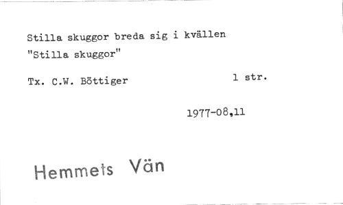 //// Stilla skuggor breda sig i kvällen "Stilla skuggor" //// Tx. C.W. Bottiger //// 1977-08 //// 1 str. ,11 //// Hemmets Vän