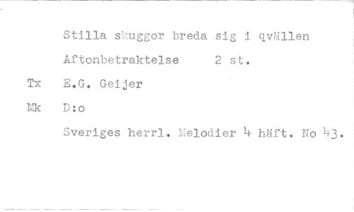 //// Stilla skuggor breda sig i qvällen //// Aftonbetraktelse 2 st, //// Tx E,G, Geijer Mk D:o //// Sveriges herrl, Melodier 4 häft. No ^3*