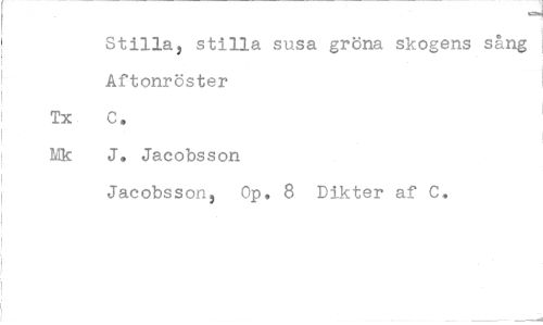 //// *a*l //// Stilla, stilla susa gröna skogens sång j Aftonröster Tx C. //// Mk J. Jacobsson //// Jacobsson, Op, 8 Dikter af C.