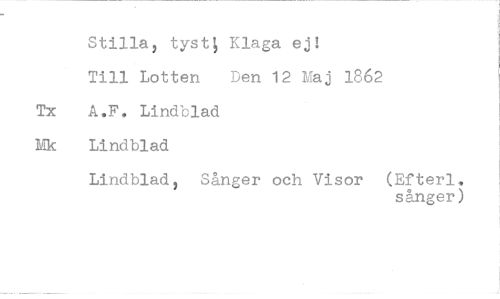 //// Stilla, tyst^ Klaga ej! //// Till Lotten Den 12 Haj 1862 //// Tx A.F. Lindblad //// Mk Lindblad //// Lindblad, Sånger och Visor (Efterl, //// sånger)