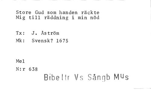 //// Store Gud som handen räckte Mig till räddning i min nöd //// Tx: J. Åström Mk: Svensk? 1675 //// Mel //// N:r 638 //// Bibehr Vs Sångb M^s
