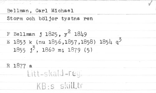 //// Bellman, Carl Michael //// Storm och böljor tystna ren //// F Bellman j 1825, y^ 18^9 E 1853 k (nu 1856,1857,1858) 185^ 1855 j3^ 1860 m; 1879 (5) //// R 1877 a