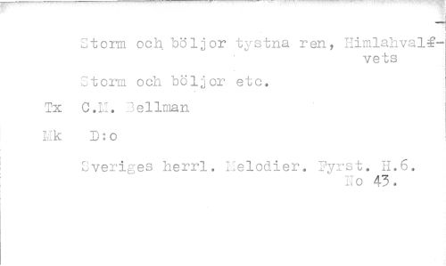 //// Storm och. böljor tystna ren, Himlahval#- //// vets //// Storm och böljor etc. //// C.1.1. Bellman D: o //// Sveriges herrl. Helodier, Fyrst. H.6. //// No 43.