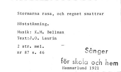 //// Stormarna rasa, och regnet smattrar //// Höststämning. //// Musik: K.M. Bellman Text:J.O. Laurin //// 2 str. mel. " ^ //// nr 87 s. 46 ^ //// för skcia //// Hammarlund //// cnaer //// och hem //// 1921