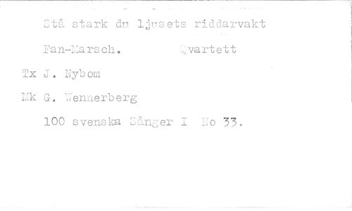 //// Gtå stark du ljusets riddarvakt Fan-Karsch. kvartett //// Ix J. Nybom I.lk G. V."enne rb e rg //// 100 svenska Sånger I Eo 33.