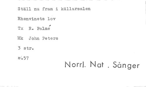 //// Ställ nu fram i källarsalen Rhenvinets lov //// Tx R. Palme //// Mk John Peters //// 3 str. //// s'.57 //// Norr). Nat . Sånger
