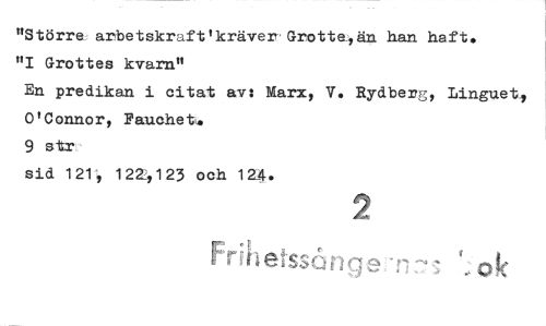 //// "Större arbetskraffkräver Grotte^än han haft. //// "I Grottes kvarn" //// En predikan i citat av: Marx, V. Rydberg, Linguet, 0'Connor, Fauchetn 9 str //// sid 121, 122:, 123 och 124.