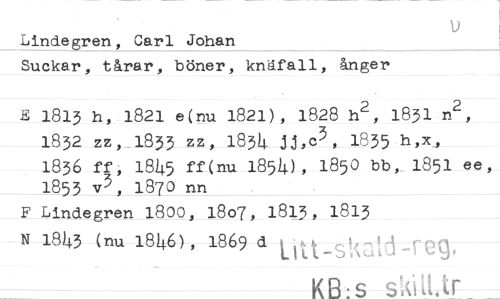 //// u //// Lindegren, Carl Johan //// Suckar, tårar, böner, knäfall, ånger //// E 1813 h, 1821 e(nu 1821), 1828 h^, 1831 n^, //// 1832 zz, 1833 zz, 183^ jj,c3, 1835 //// 1836 ff, 18^5 ff(nu 1854), IS50 bb, 1&51 ee, 1853 v3, 1870 nn //// F Lindegren 1800, 1807, 1813, 1813 N 18^3 (nu 18^6), 1869 d //// KB:S skiH.tr