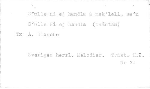 //// Culle ni ej handla å mek'lell, sa*n S'ulle Ni ej handla (tvåstäm) //// Tx A. 'lanche //// Sveriges herrl. l.Ielodier. T^åst, H.2. //// No 21