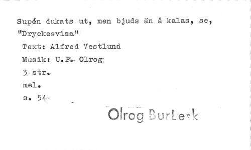 //// Supén dukats ut, men bjuds än å kalas, se, "Dryckesvisa" //// Text: Alfred Vestlund Musik: U.3?^. Olrog 3 str. mel. s. 54 //// 0!rca BurLe-!<