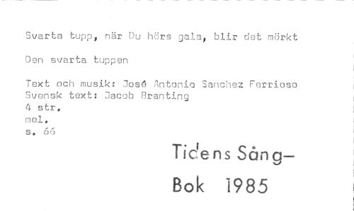 //// Svarta tupp, när Du hörs gala, blir dst mörkt Den svarta tuppen //// Text och musik: José Antonio Sanchez Ferrioso Svensk text: Jacob Branting //// 4 str, mel. s. 66