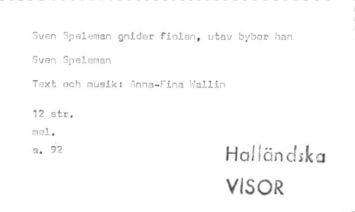//// Sven Speleman gnider fiolen, utav bybor han Sven Speleman //// Text och musik: "nna-Fina Wallin //// 12 str. //// mel. //// s. 92 //// ViSOR //// **1