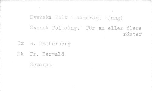 //// Svenska Folk i samdrägt sjung! //// Svensk Folksång. För en eller flera //// röster //// H. Satherberg Fr. Derwald Separat