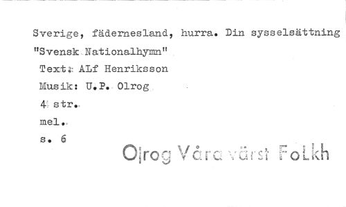//// Sverige, fädernesland, hurra. Din sysselsättning "Svensk Nationalhymn" //// Text3: ALf Henriksson Musik: U.P. Olrog