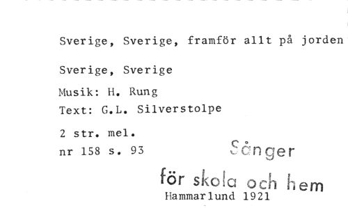 //// Sverige, Sverige, framför allt på jorden //// Sverige, Sverige //// Musik: H. Rung //// Text: G.L. Silverstolpe //// 2 str. mel. //// nr 158 s. 93 Sånger //// Hammarlund 1921