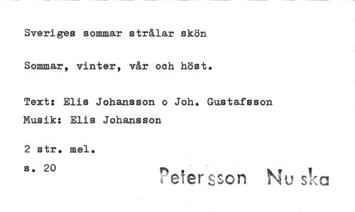 //// Sveriges sommar strålar skön Sommar, vinter, vår och höst. //// Text: Elis Johansson o Joh. Gustafsson Musik: Elis Johansson //// 2 str. mel. //// s. 20 ^ T t //// reiergson Nu ska