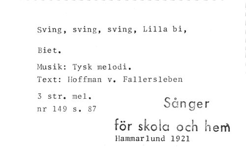 //// Sving, sving, sving, Lilla bi, //// Biet. //// Musik: Tysk melodi. //// Text: Hoffman v. Fallersleben //// 3 str. mel. //// nr 149 s. 87 ^QMger //// för skcia och h //// Hammarlund 1921