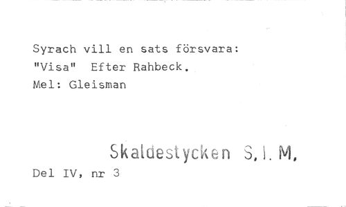 //// Syrach vill en sats försvara "Visa" Efter Rahbeck. //// Mel: Gleisman //// Skatdestycken //// Del IV, nr 3
