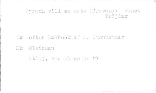 //// 2yrach vill en sats försvara: Vine //// fröjdar //// Tx efter Rahbeck af J, ^tenhammar Lik Gleisman //// Ctåhl, Vid lålen No 27