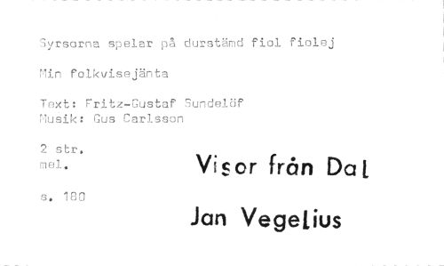 //// Syrsorna spelar på durstämd fioi fiolej //// i"!in folkvisejänta //// Text: Fritz-Gustaf Sundelöf 'lusik: Gus Carlsson //// 2 str, //// ^* Vi$cr fron Da[ //// s. 180 //// Jan Vegetius