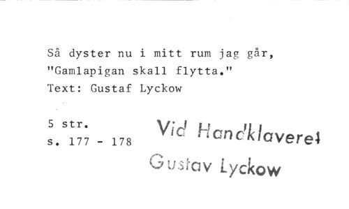 //// Så dyster nu i mitt rum jag går, "Gamlapigan skall flytta." //// Text: Gustaf Lyckow //// 5 str. s. 177 - 1 //// ViJ HcnJidavere! kiv Lyckow //// 78