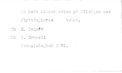 //// Cå hett skiner solen på Nilvågen ner Flyttfoglarne tvåst. //// Tx E. Tegnér Hk B. Crusell //// Normalsångbok H 81.
