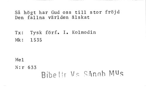 //// Så högt har Gud oss till stor fröjd Den fallna världen älskat //// Tx: Tysk förf. I. Kolmodin Mk: 1535 //// Mel //// N:r 633 //// BibeHr ^s ^nnh
