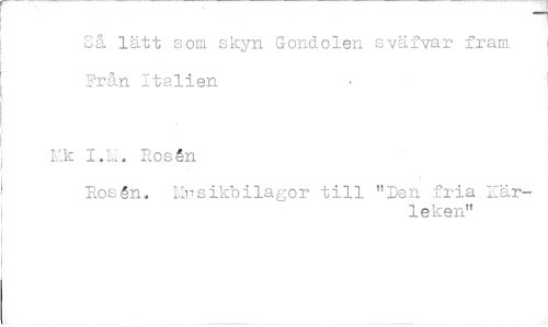 //// Så lätt som skyn Gondolen sväfvar fram Från Italien //// k I.H. Rosén //// Rosén. Musikbilagor till "Den fria Eär- //// leken"
