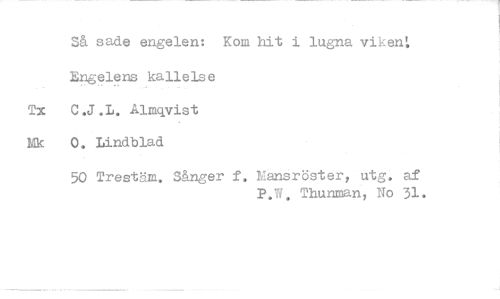 //// S& sade engelen: Kom hit i lugna vike^ //// EngeleHs kallelse //// Tx C.J.L. Almqvist //// Mk 0. Lindblad //// 50 Trestäm. S&nger f. Mansröster, utg, af //// P.W. Thunman, No 31.