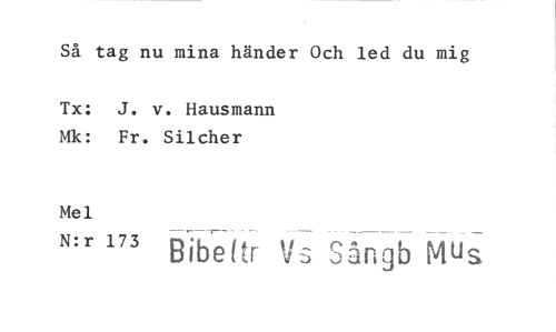 //// Så tag nu mina händer Och led du mig //// Tx: J. v. Hausmann Mk: Fr. Silcher //// Mel //// N:r 173 //// Bibeftr Vs Sångb