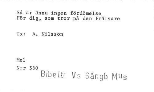 //// Så är ännu ingen fördömelse För dig, som tror på den Frälsare //// Tx: A. Nilsson //// Mel //// N:r 380 //// Bibe itr V s Sar.gb M^s