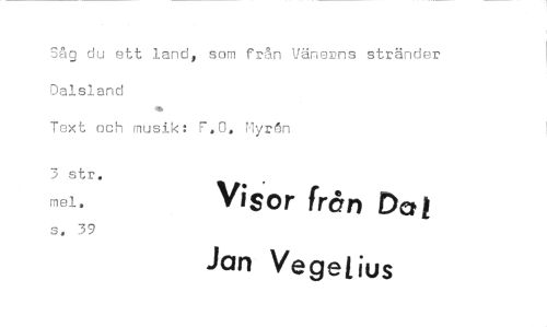 //// 3åg du ett land, som från Vänerns stränder Dalsland //// Text och musik: P.O. Hyrån //// 3 str. mel, s. 39 //// V^sor fron Jan Vegetius