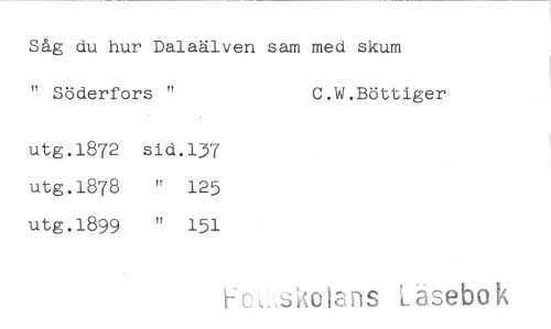 //// Såg du hur Dalaälven //// " Söderfors " //// utg.1872 sid.137 utg.1878 " 125 utg.1899 " 151 //// sam med skum //// C.W.Bottiger //// Fc ^.skolans Läsebok