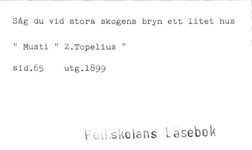 //// Såg du vid stora skogens bryn ett litet hus //// " Musti " Z.Topelius " sid.65 utg.1899 //// S uu.sMians Läsebok