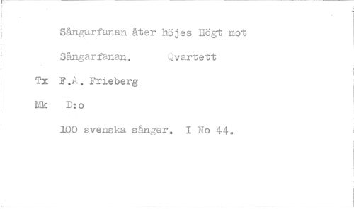 //// Sångarfanan åter höjes Högt mot Sångarfanan. Qvartett //// Tx F .A. Frieberg Mk D:o //// 100 svenska sånger. I No 44.