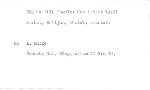 //// Säg du till fogeln: Kom i mitt tjäll Frihet, Solljus, Kärlek, Qvartett //// L. Mi eke //// Svenska Nat. Sång. Album VI N:o 70,