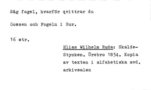 //// Säg fogel, hvarför qvittrar du //// Gossen och Fogeln i Bur. //// 16 str. //// Elias Wilhelm Ruda: Skalde-Styeken. Örebro 1834. Kopia av texten i alfabetiska avd. arkivsalen